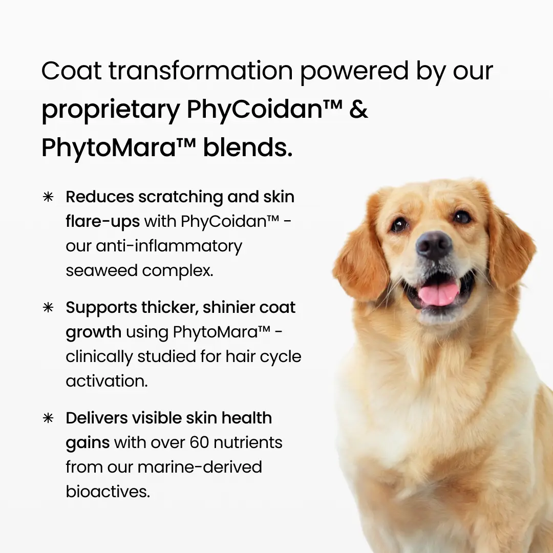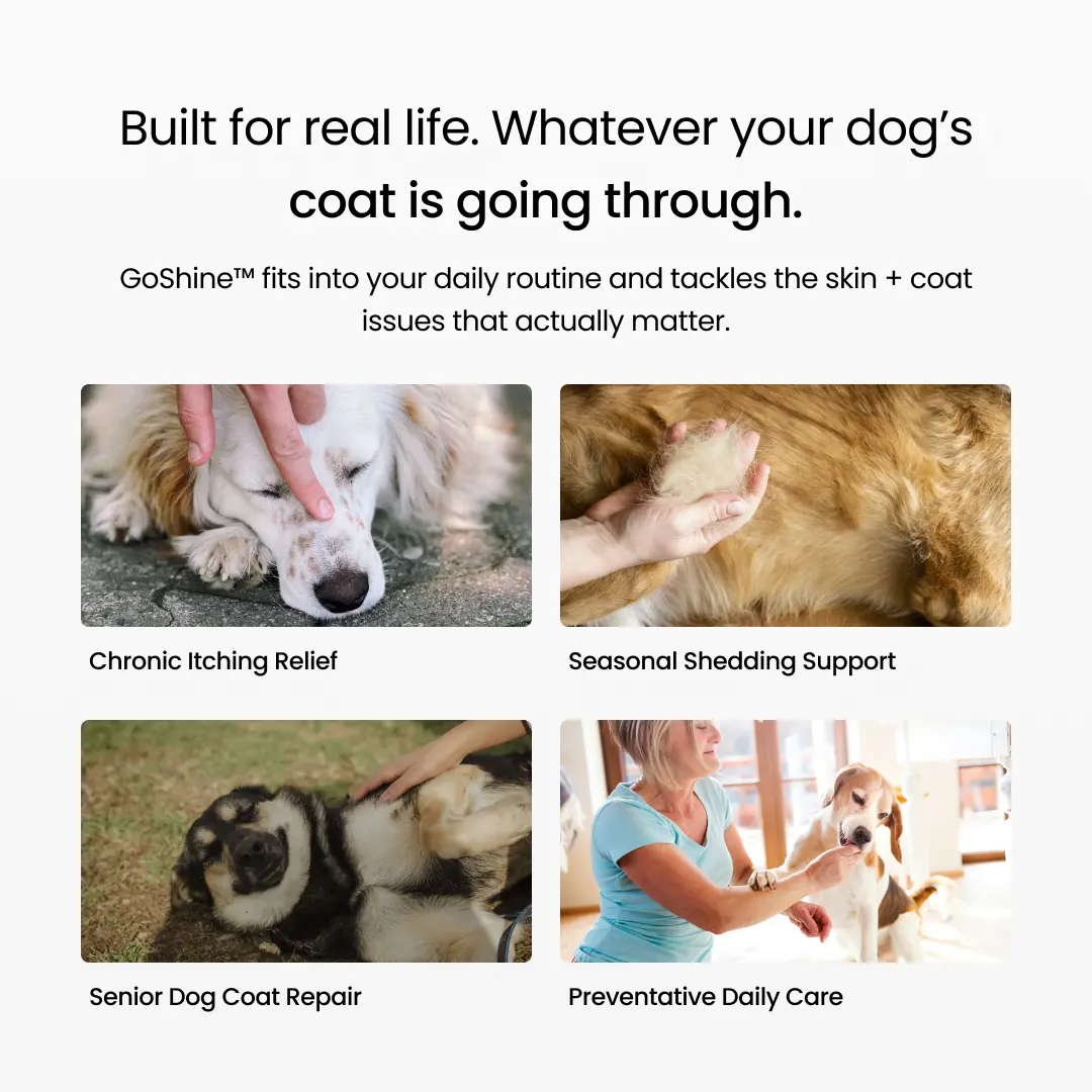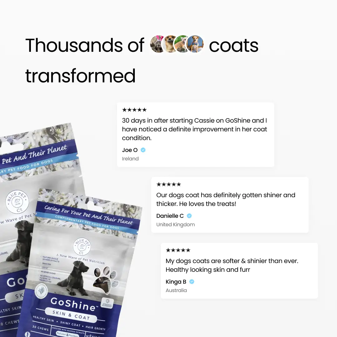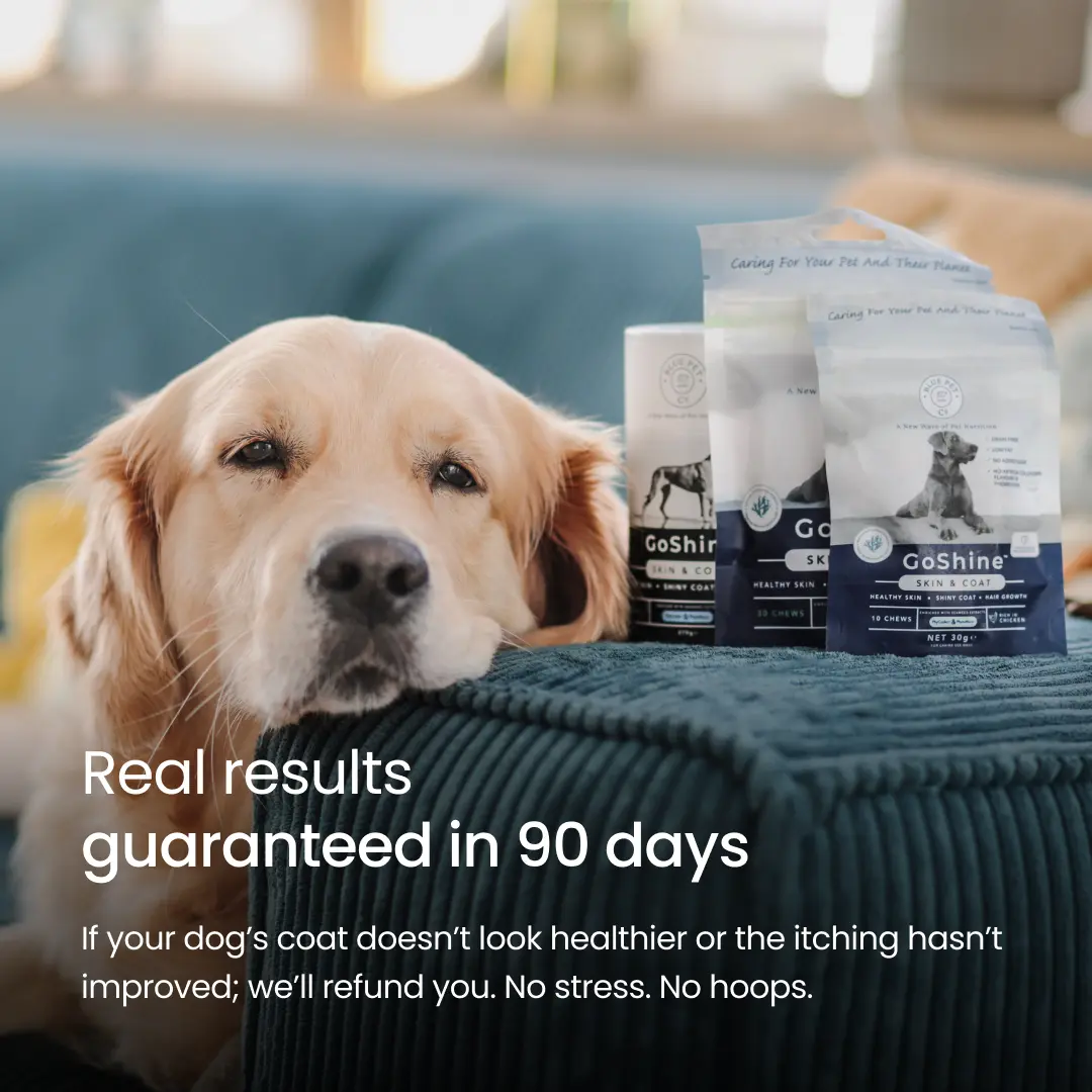 Experience the difference with GoShine™—the only dog supplement powered by proprietary seaweed blends. Designed to reduce itching, restore skin health, and bring back a glossy shine, it delivers visible results in just 90 days.